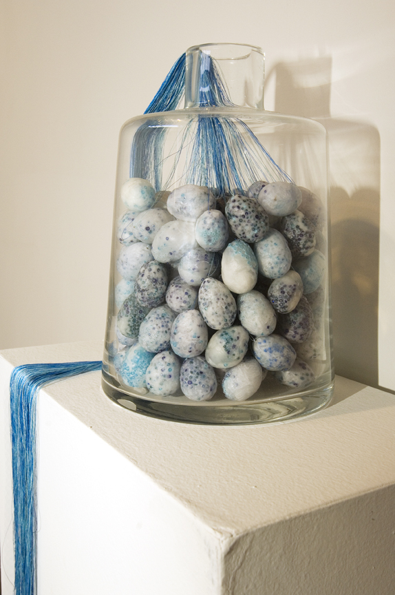 beewax, glass beads, thread, blown-glass jar