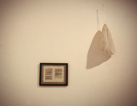 silk bag, photo transfer -- erased text page, etched glass 8s x 10w x 25h & 11h x 14w