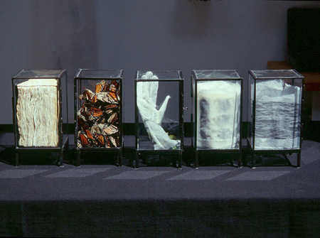 Glass and Metal Vitrines, Silk, Butterfly wings, Bible, Photo Transfer size varies, each vitrine 10h x 5w x 5d